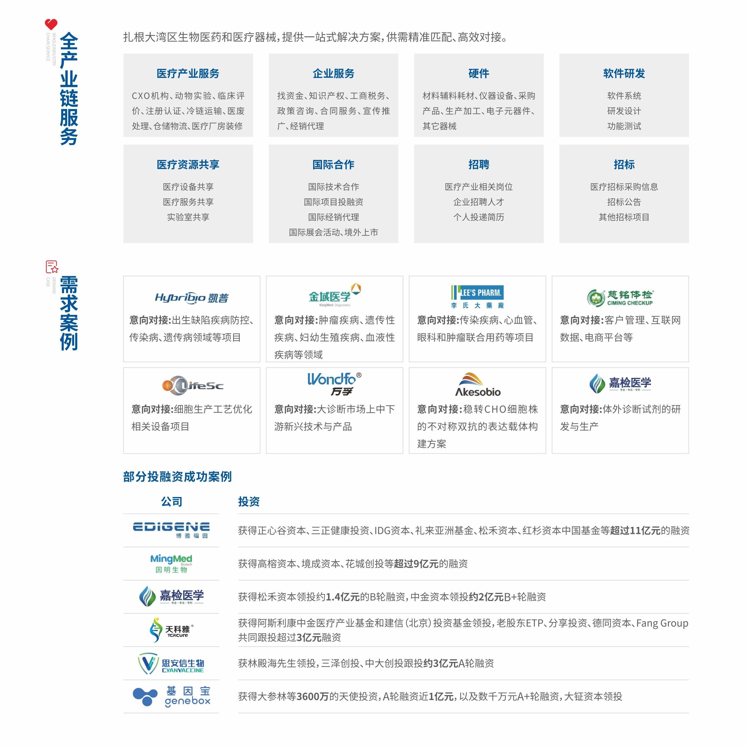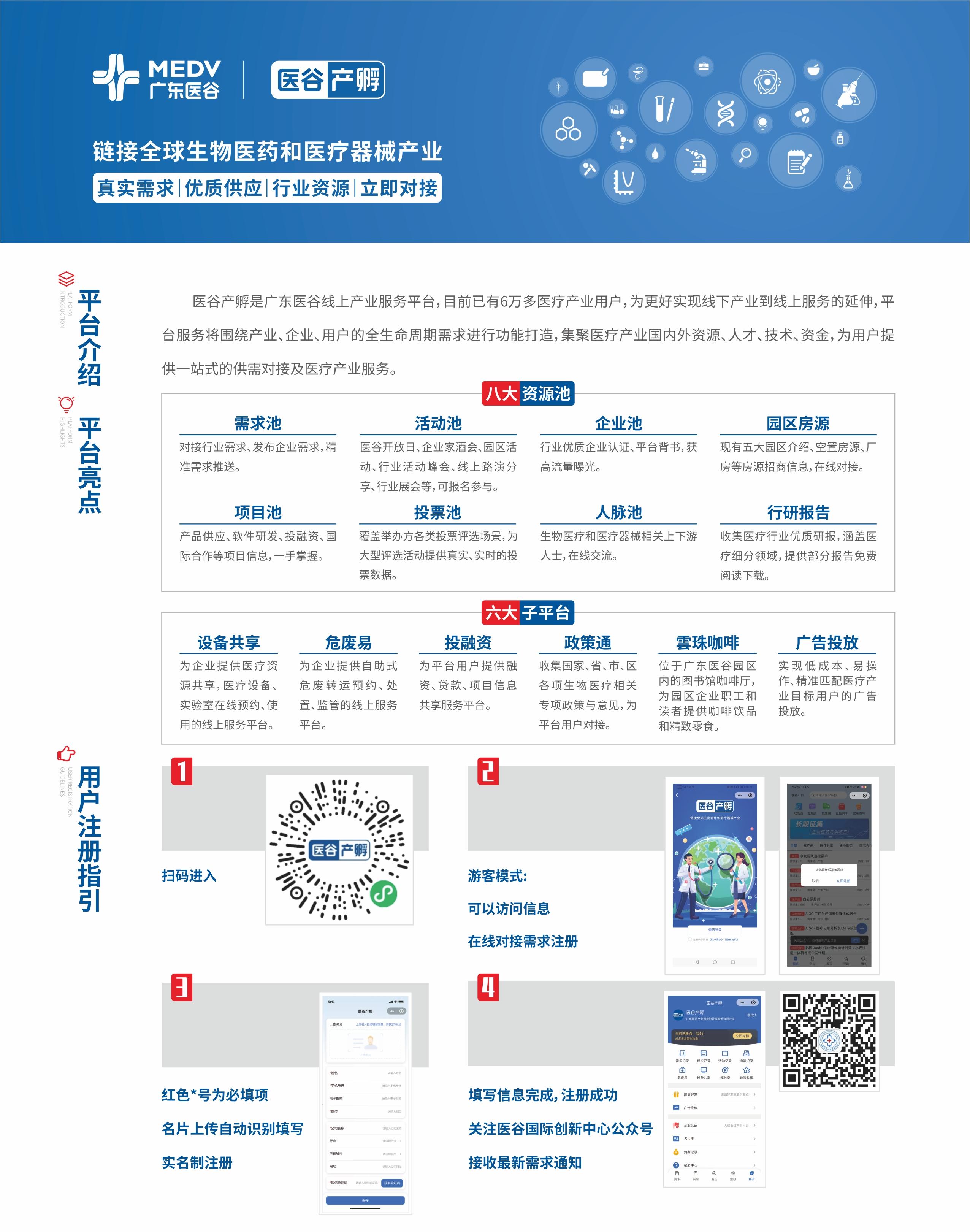 為更好實現(xiàn)線下產(chǎn)業(yè)到線上服務(wù)的延伸,廣東醫(yī)谷自主開發(fā)“醫(yī)谷產(chǎn)孵”產(chǎn)業(yè)服務(wù)平臺,平臺服務(wù)將圍繞產(chǎn)業(yè)、企業(yè)、用戶的全生命周期需求進行功能打造,積累需求、項目、人脈、企業(yè)、活動五大資源池,集聚醫(yī)療產(chǎn)業(yè)國內(nèi)外資源、人才、技術(shù)、資金,為用戶提供一站式的供需對接及醫(yī)療產(chǎn)業(yè)服務(wù),目前已有6萬多醫(yī)療產(chǎn)業(yè)用戶。