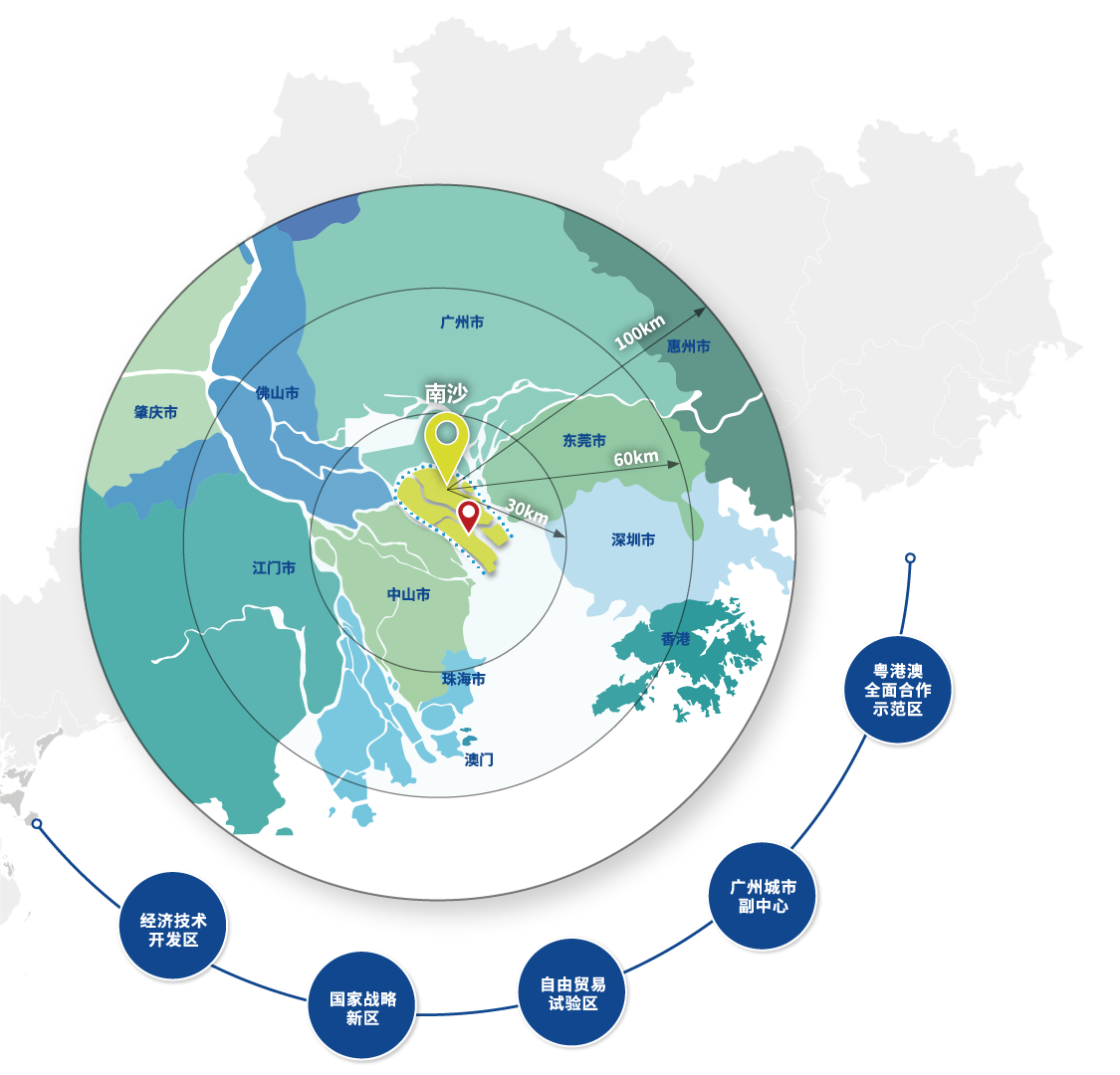 地處五大機(jī)場(chǎng)群核心,毗鄰南沙港(吞吐量居世界第十一),貿(mào)易往來便捷。