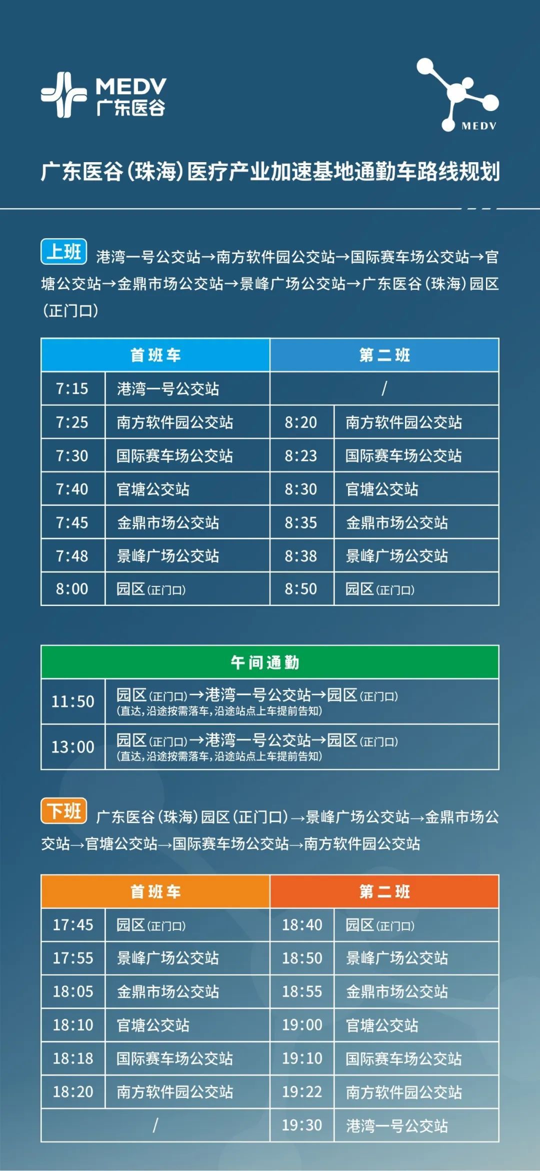 穿梭巴士以港灣1號——廣東醫(yī)谷·珠海生命科學(xué)園兩地為起始點往返,途中設(shè)置了南方軟件園公交站→國際賽車場公交站→官塘公交站→金鼎市場公交站→景峰廣場公交站等5個站點,逢工作日運行。