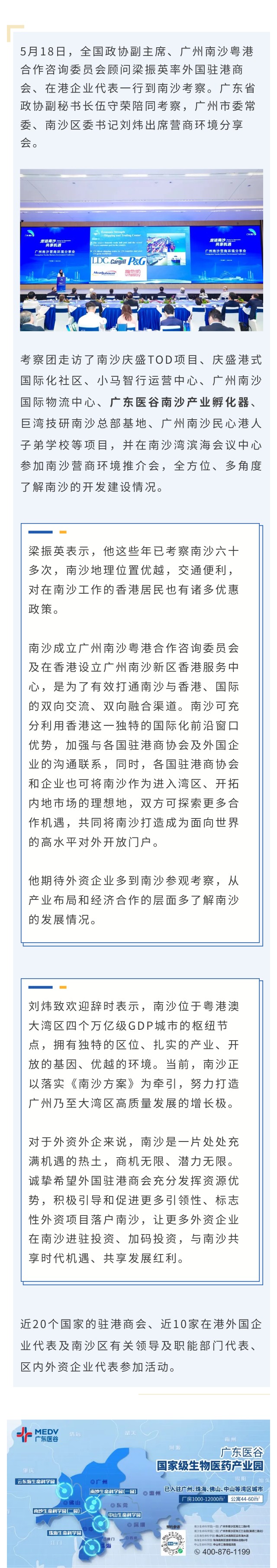 全國政協(xié)副主席、廣州南沙粵港合作咨詢委員會顧問梁振英率外國駐港商會、在港企業(yè)代表蒞臨南沙廣東醫(yī)谷考察