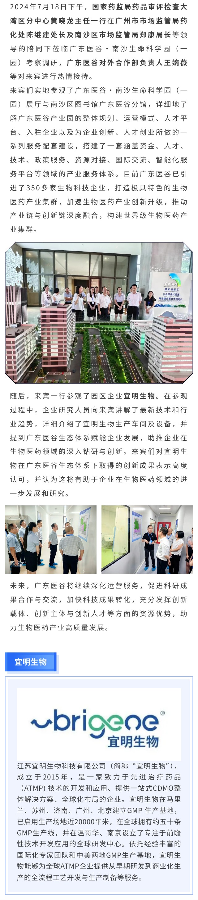 國(guó)家藥監(jiān)局藥品審評(píng)檢查大灣區(qū)分中心黃曉龍主任一行蒞臨廣東醫(yī)谷考察調(diào)研