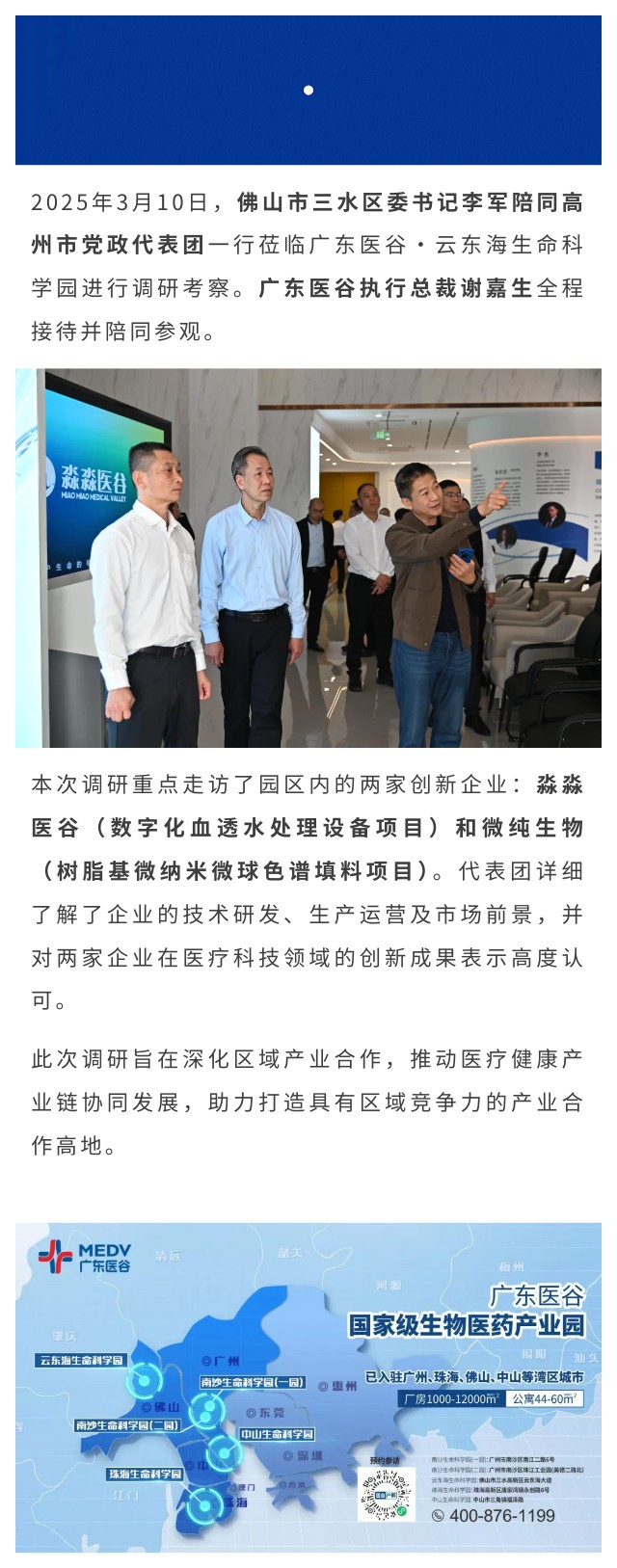 佛山市三水區(qū)委書記李軍陪同高州市黨政代表團(tuán)調(diào)研廣東醫(yī)谷