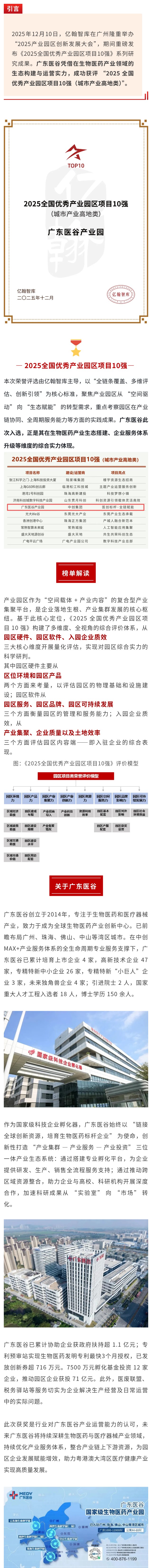 廣東醫(yī)谷榮獲 “2025 全國優(yōu)秀產(chǎn)業(yè)園區(qū)項目 10 強(qiáng)(城市產(chǎn)業(yè)高地類)” 榮譽