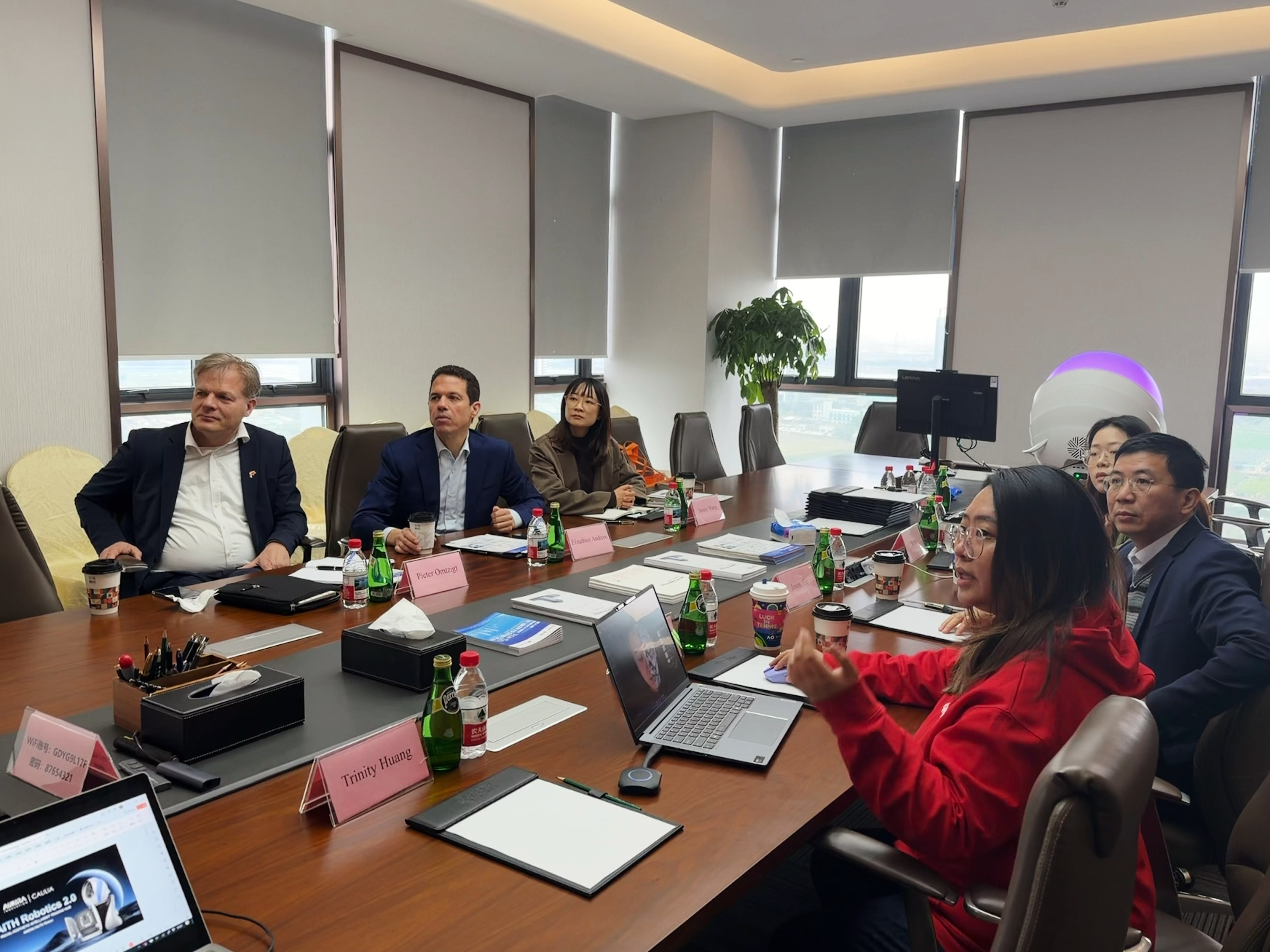 隨后,來賓一行與園區(qū)企業(yè)廣州美央科技進行座談交流,由美央科技海外市場負(fù)責(zé)人莫舒韻及團隊向代表團介紹了公司的產(chǎn)品管線與研發(fā)進展。作為英國CALILA醫(yī)療集團旗下企業(yè),美央科技聚焦高端醫(yī)療機器人與精密儀器研發(fā),匯聚了來自全球頂尖院校的多學(xué)科專家團隊,涵蓋臨床醫(yī)學(xué)、航空航天、精密制造、人工智能及醫(yī)學(xué)圖像等領(lǐng)域,致力于以AI技術(shù)驅(qū)動醫(yī)療機器人與智能硬件創(chuàng)新。