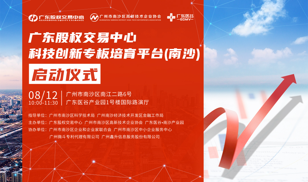 8月12日,在廣州市南沙區(qū)科學(xué)技術(shù)局、廣州南沙經(jīng)濟(jì)技術(shù)開發(fā)區(qū)金融工作局的指導(dǎo)下,由廣東股權(quán)交易中心、廣州市南沙區(qū)高新技術(shù)企業(yè)協(xié)會(huì)、廣東醫(yī)谷主辦,由廣州市南沙區(qū)企業(yè)和企業(yè)家聯(lián)合會(huì)、廣州市南沙區(qū)中小企業(yè)服務(wù)中心、廣州微斗專利代理有限公司、廣州鑫升信息服務(wù)股份有限公司協(xié)辦的“廣東科創(chuàng)專板培育服務(wù)平臺(tái)(南沙)”啟動(dòng)儀式在廣東醫(yī)谷南沙產(chǎn)業(yè)園成功舉辦。廣州市南沙區(qū)科學(xué)技術(shù)局副局長馮杰、廣州南沙經(jīng)濟(jì)技術(shù)開發(fā)區(qū)金融工作局副局長陳婉清、廣東股權(quán)交易中心副總經(jīng)理李潤才、廣州市南沙區(qū)高新技術(shù)企業(yè)協(xié)會(huì)執(zhí)行會(huì)長朱武、中創(chuàng)集團(tuán)總裁、廣東醫(yī)谷聯(lián)合創(chuàng)始人鄭貴輝、廣東醫(yī)谷執(zhí)行總裁謝嘉生等相關(guān)領(lǐng)導(dǎo)及各類企業(yè)服務(wù)機(jī)構(gòu)、入庫重點(diǎn)培育企業(yè)等近百人參加本次活動(dòng)。