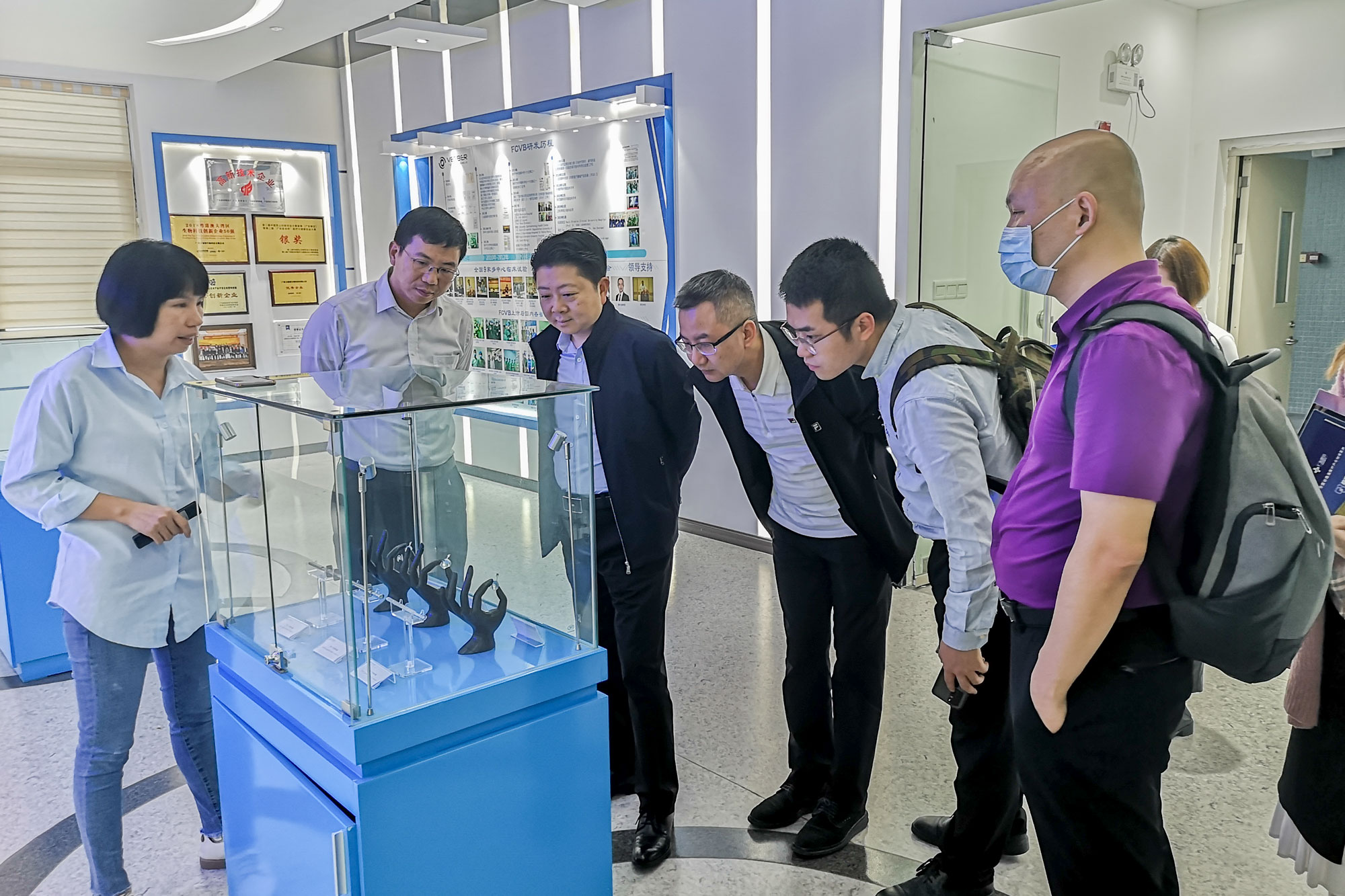 交流中,來賓一行實地考察了園區(qū)企業(yè)——衛(wèi)視博。廣州衛(wèi)視博生物科技有限公司是一家專注于眼科創(chuàng)新產(chǎn)品研發(fā)、生產(chǎn)和銷售的國家高新技術(shù)企業(yè)。主要產(chǎn)品包括折疊式人工玻璃體球囊、近視后鞏膜加固系統(tǒng)和球周藥物緩釋系統(tǒng)等。其中代表產(chǎn)品折疊式人工玻璃體球囊(FCVB)是國際首創(chuàng)的挽救眼球的人工器官,可以精細模擬人眼玻璃體結(jié)構(gòu)和功能,入選國家科技部2018年醫(yī)療器械創(chuàng)新產(chǎn)品目錄,該產(chǎn)品還獲得了科技部863項目、十二五科技支撐計劃等項目的資助,擁有中國、美國、俄羅斯、澳大利亞、日本等專利22項。