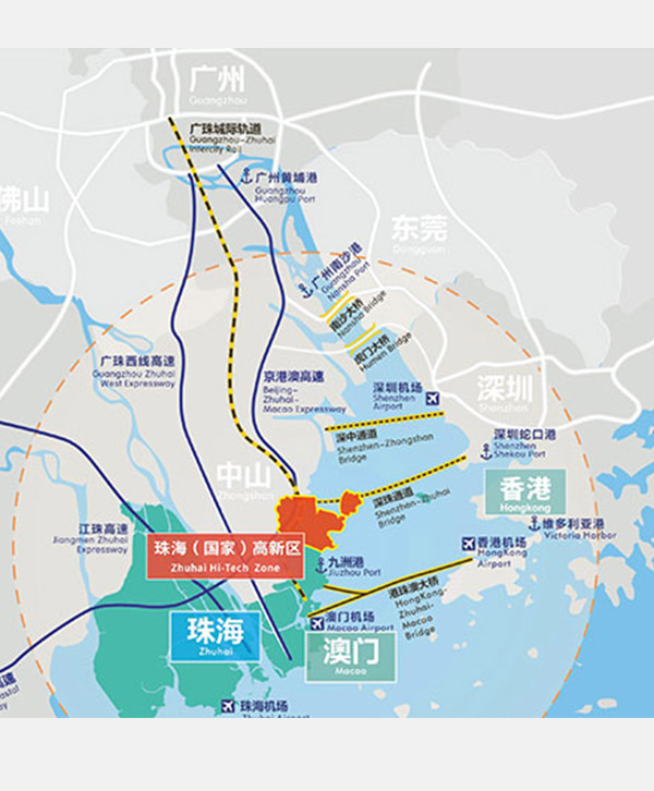 Located at the "North Gate" of Zhuhai, creating a one-hour economic circle of Guangdong, Hong Kong and Macao
